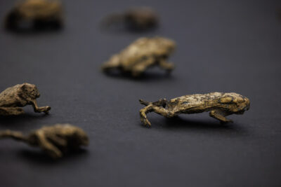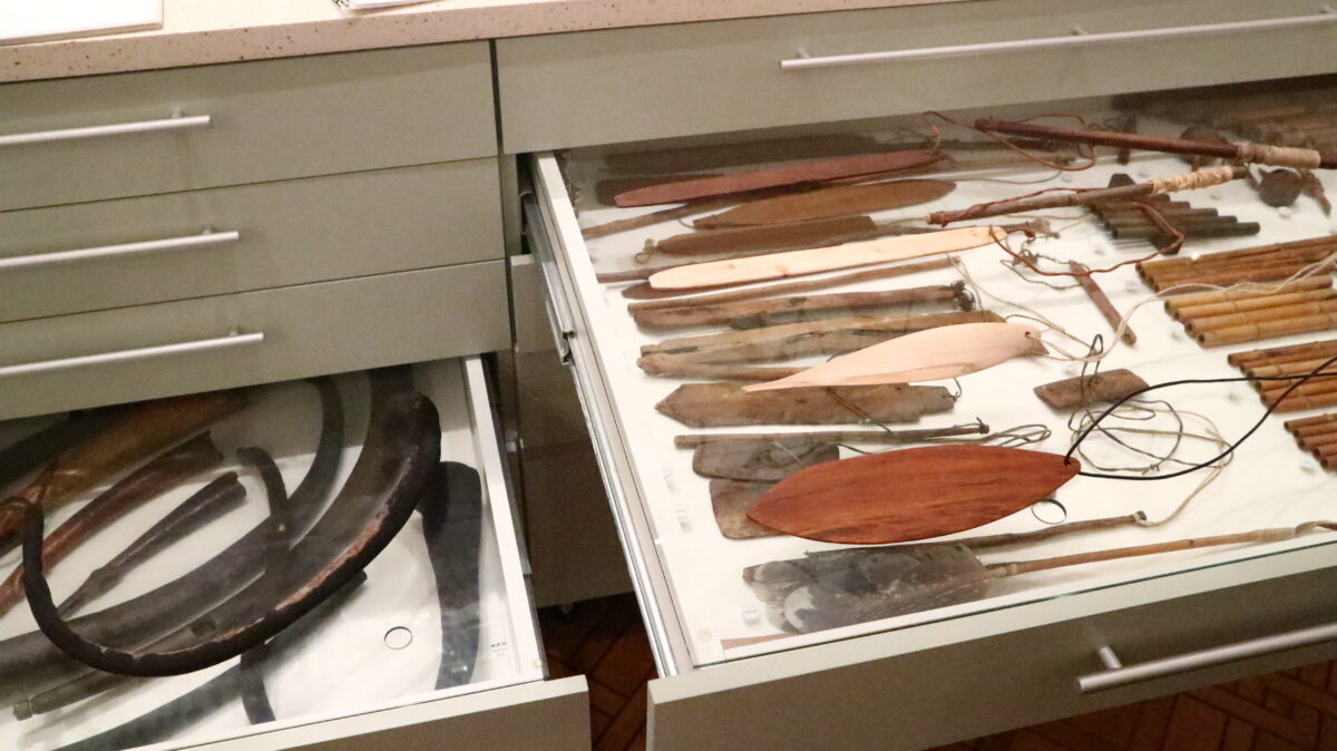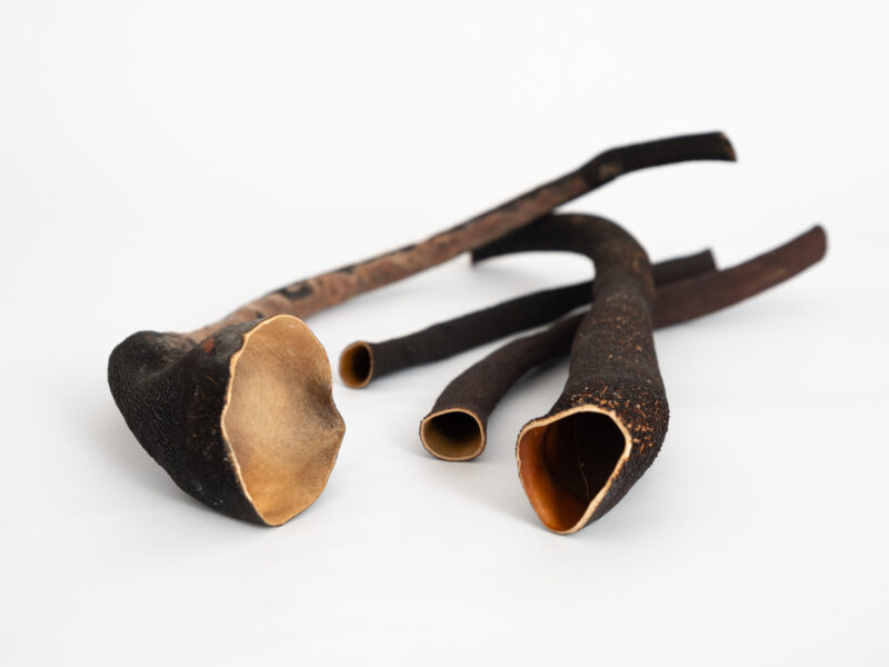 | Bullroarers or “!goin !goin,” are aerophonic devices that are swung around their own axis to produce sound through air vibrations. These instruments were used by the ǀXam-speaking San and Khoikhoi to communicate with bees. Examples of such instruments can be found in the Kirby Collection of Indigenous Musical Instruments at the College of Music in Cape Town. The collection also includes around 600 traditional South African instruments gathered by Professor Percival R. Kirby (1887–1970). To preserve these instruments, they can neither be touched nor played.To address the “silencing” of these instruments caused by collecting, exhibiting, and conserving them, Hiving & HUMing collaborated with musician and traditional instrument makers Farai Machingambi and Thobekile Mbanda. The aim was to use the collection as inspiration to develop new instruments, thereby revitalizing Indigenous sound cultures and potentially making their spiritual dimensions accessible again. |